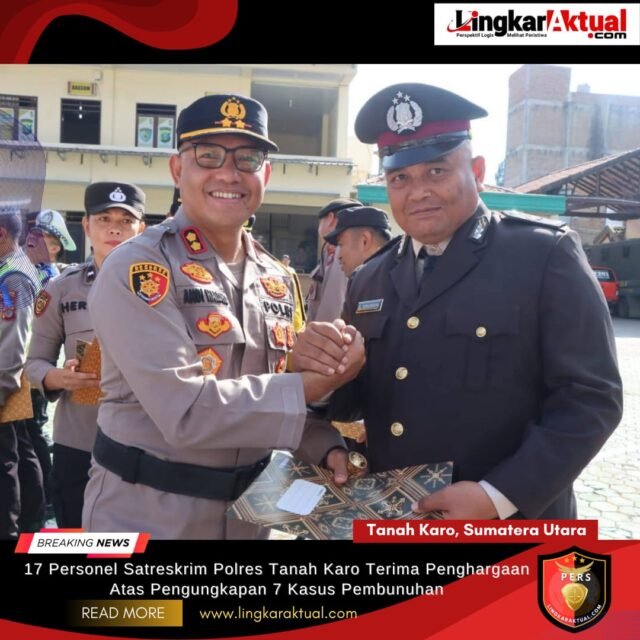TANAH KARO, SUMATERA UTARA, LINGKARAKTUAL.COM – Sebanyak 17 personel Satuan Reserse Kriminal (Satreskrim) Polres Tanah Karo menerima penghargaan atas keberhasilan menangani dan mengungkap tujuh kasus pembunuhan secara menyeluruh. Penghargaan tersebut diberikan dalam rangkaian upacara yang digelar di Mapolres Tanah Karo, Rabu (11/2/2026).