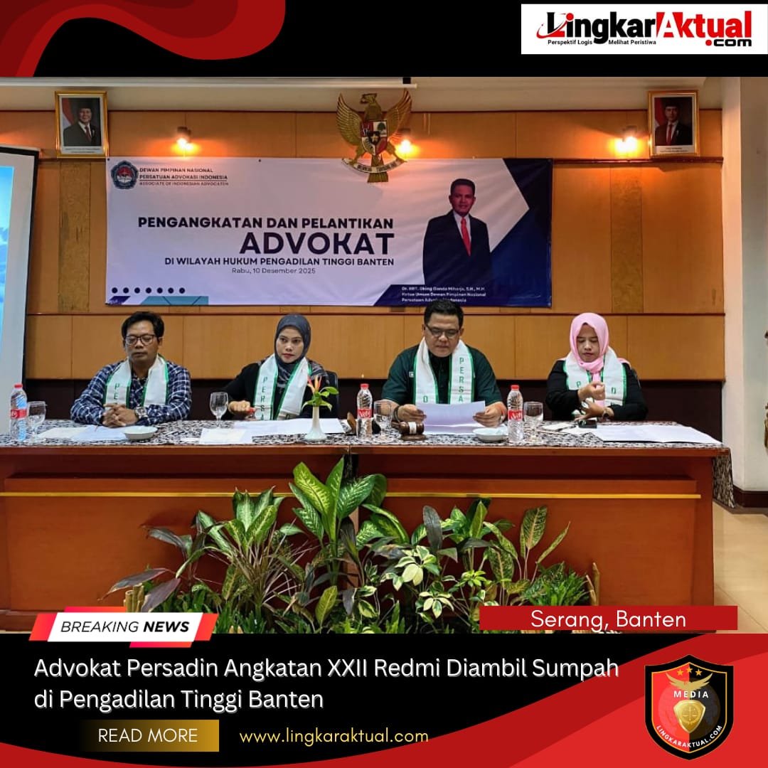 SERANG, BANTEN || LINGKARAKTUAL.COM || – Advokat Persatuan Advokasi Indonesia (PERSADIN) Angkatan XXII resmi diambil sumpah sebagai advokat bersama organisasi advokat lainnya di Pengadilan Tinggi Banten, Kamis (11/12/2025)