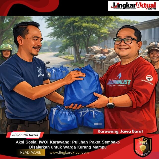 KARAWANG, JAWA BARAT, LINGKARAKTUAL. COM – Ikatan Wartawan Online Indonesia (IWOI) Dewan Pimpinan Daerah (DPD) Kabupaten Karawang menyalurkan puluhan paket sembako kepada kaum dhuafa, fakir miskin, dan satpam perumahan di lingkungan Sekretariat IWOI, Perum Jasmine Village, Karawang, Rabu (18/3/2026).