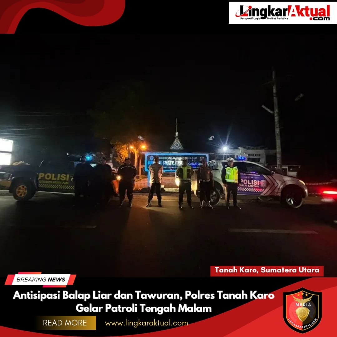 TANAH KARO, SUMATERA UTARA || LINGKARAKTUAL.COM || – Dalam rangka menjaga situasi keamanan dan ketertiban masyarakat tetap kondusif, Polres Tanah Karo melaksanakan patroli malam pada hari Senin(12/1/2026), sekira pukul 22.30 WIB. Kegiatan tersebut dipimpin oleh Pawas IPTU Agustina Parhusip, S.H., M.H., didampingi Padal IPDA Antonius Tarigan dan IPDA Kami Karo Karo, bersama personel Piket Sipropam serta piket fungsi.