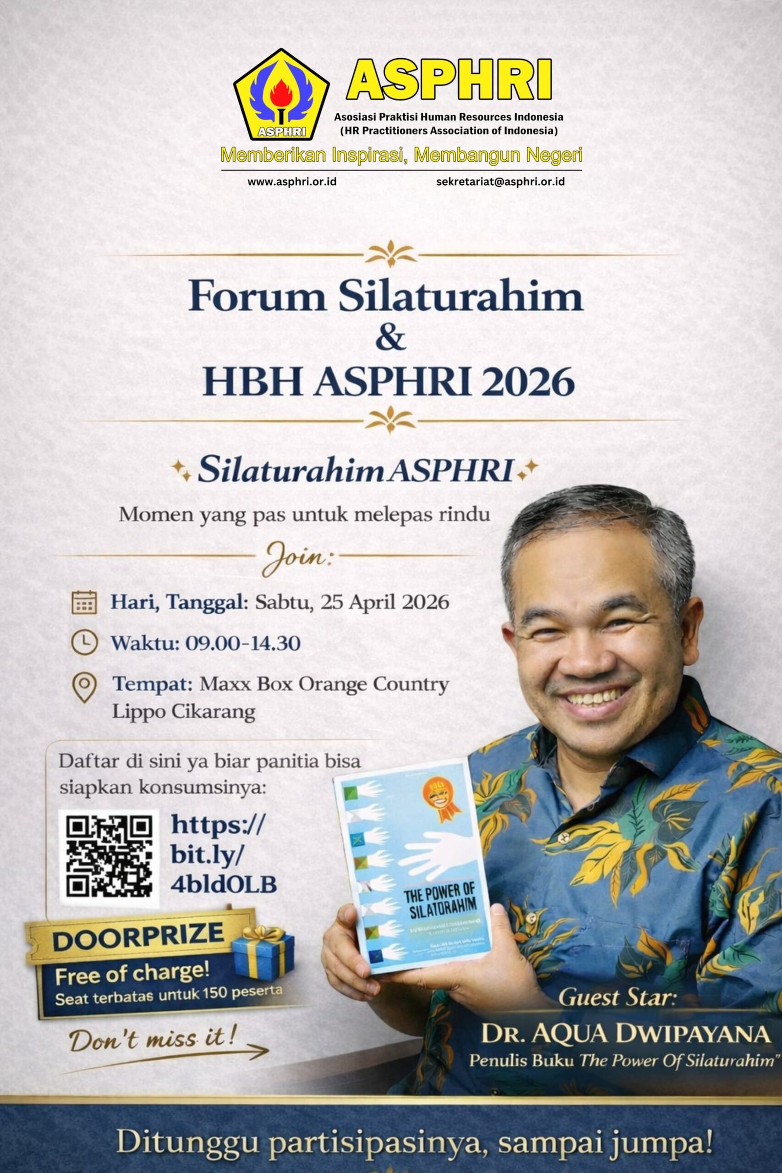 Kegiatan ini dijadwalkan berlangsung pada Sabtu, 25 April 2026, pukul 09.00–14.30 WIB di MaxxBox Orange County, Lippo Cikarang Kab Bekasu Forum tersebut terbuka bagi seluruh anggota ASPHRI dan Praktisi Human Resource dari berbagai wilayah di Indonesia.