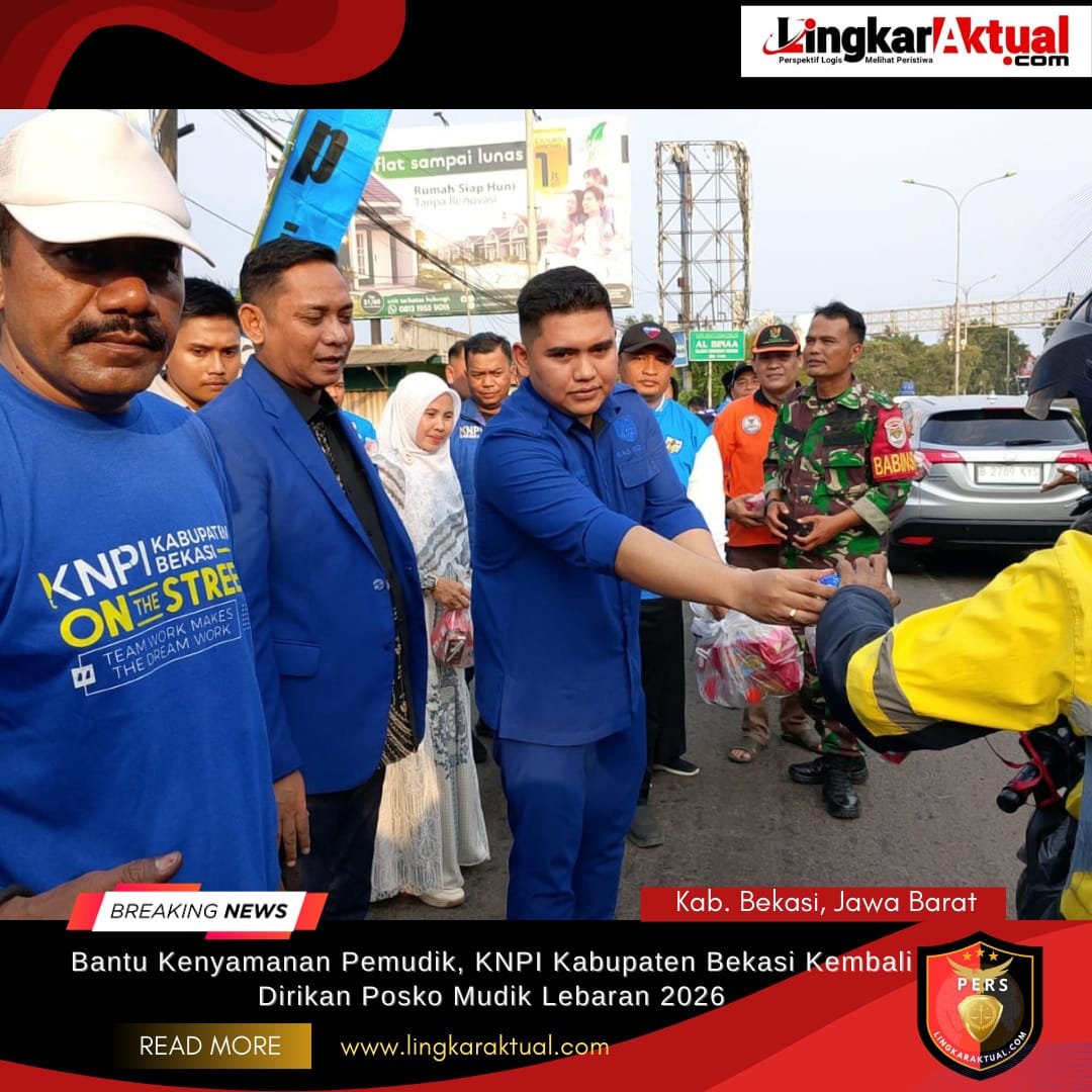 KABUPATEN BEKASI, JAWA BARAT, LINGKARAKTUAL.COM – Dewan Pengurus Daerah Komite Nasional Pemuda Indonesia (DPD KNPI) Kabupaten Bekasi menunjukkan kepeduliannya terhadap masyarakat dengan kembali mendirikan Posko Mudik Lebaran 2026. Posko yang berlokasi di Jalan Raya Pantura, Desa Kedungwaringin, Kecamatan Kedungwaringin ini diresmikan langsung oleh Plt. Bupati Bekasi, dr. Asep Surya Atmaja, pada Rabu (18/03/2026).