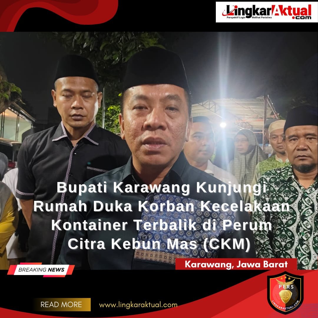 KARAWANG, JAWA BARAT, LINGKARAKTUAL.COM – Bupati Karawang, Aep Syaepuloh, mengunjungi rumah duka di perum Citra Kebun Mas (CKM) korban kecelakaan tragis akibat truk kontainer yang terbalik di kolong jembatan CKM jalan baru Karawang, pada Senin (16/02/2026).