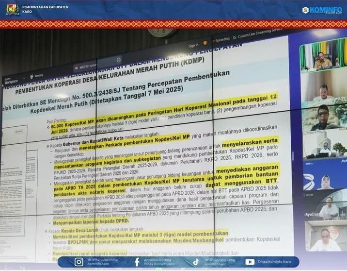TANAH KARO, Sumatera Utara || Lingkaraktual.com || Bupati Karo, Brigjen Pol (Purn.) Dr. dr. Antonius Ginting, Sp.OG., M.Kes., mengikuti Rapat Koordinasi Pengendalian Inflasi Daerah yang dirangkaikan dengan Sosialisasi Instruksi Presiden Nomor 9 Tahun 2025 tentang Percepatan Pembentukan Koperasi Desa/Kelurahan Merah Putih secara daring bertempat di Ruang Karo Command Center Kantor Bupati Karo, Kabanjahe, Senin (19/05/2025).