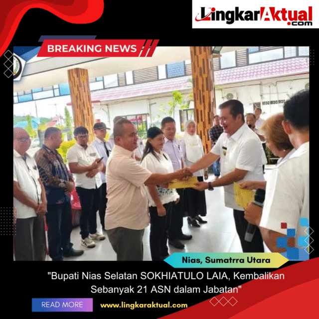 NIAS SELATAN, Sumatera Utara || – Lingkaraktual.com – Bupati Nias Selatan Sokhiatulo Laia, mengembalikan sebanyak 21 orang ASN untuk bertugas kembali dalam jabatan yang telah diemban sebelumnya di Tahun 2024 sebagai Kepala Sekolah , dengan menyerahkan Surat Perintah Tugas (SPT), di Aula Pendopo Rumah Dinas Bupati Nias Selatan, Pada hari Rabu, (21/05/2025).