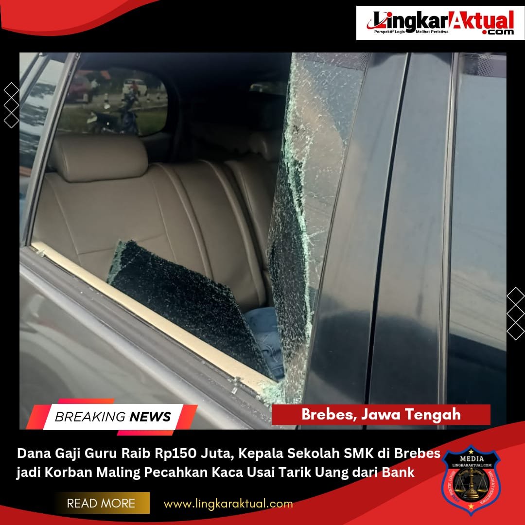 BREBES, Jawa Tengah || Lingkaraktual.com || – Aksi pencurian dengan modus pecah kaca mobil kembali terjadi di wilayah Brebes. Kali ini, korbannya adalah Mardiyanto, Kepala Sekolah SMK Ma’arif NU Paguyangan. Uang tunai senilai Rp150 juta yang baru saja diambil dari dua bank raib digondol maling, Jumat siang (1/8/2025), saat mobil diparkir untuk salat Jumat.