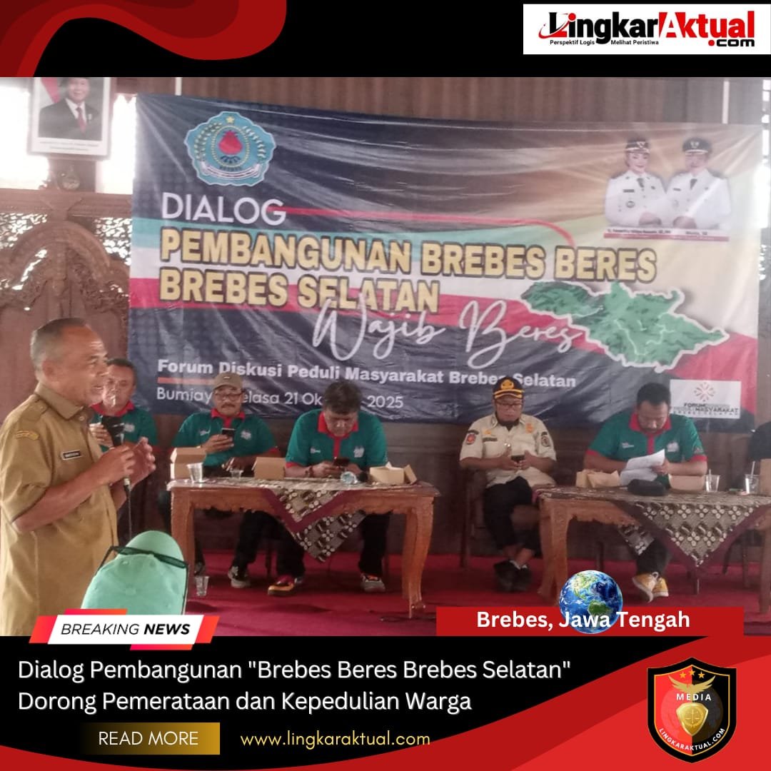 BREBES, JAWA TENGAH || LINGKARAKTUAL.COM || – Selasa 21 Oktober 2025 — Sejumlah tokoh masyarakat, perwakilan kecamatan, dan pemangku kepentingan menghadiri kegiatan Dialog Pembangunan Brebes Beres Brebes Selatan yang digelar di Pendopo 2 Bumiayu, Kabupaten Brebes. Acara ini menjadi wadah diskusi publik untuk menyerap aspirasi dan memperkuat komitmen pemerataan pembangunan di wilayah Brebes bagian selatan.
