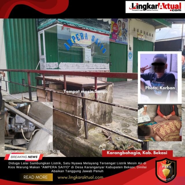 KARANGBAHAGIA, KAB. BEKASI, LINGKARAKTUAL.COM – Peristiwa tragis terjadi di wilayah Desa Karanganyar, Kecamatan Karangbahagia. Seorang warga anak-anak bernama “David Alfatih” (11) dilaporkan meninggal dunia akibat tersengat arus listrik yang diduga berasal dari mesin air di sebuah kios warung makan AMPERA SAIYO”, pada saat kondisi lingkungan sedang tergenang air. Selasa (17/02/2026).
