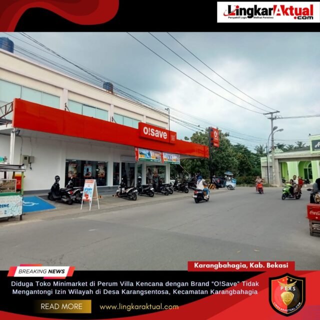 KARANGBAHAGIA, KABUPATEN BEKASI, LINGKARAKTUAL.COM – Sebuah toko minimarket dengan brand O!Save yang berlokasi di kawasan Perumahan Villa Kencana, Desa Karangsentosa, Kecamatan Karangbahagia, Kabupaten Bekasi, diduga belum mengantongi izin wilayah dari pemerintah setempat. Jumat (06/03/2026).