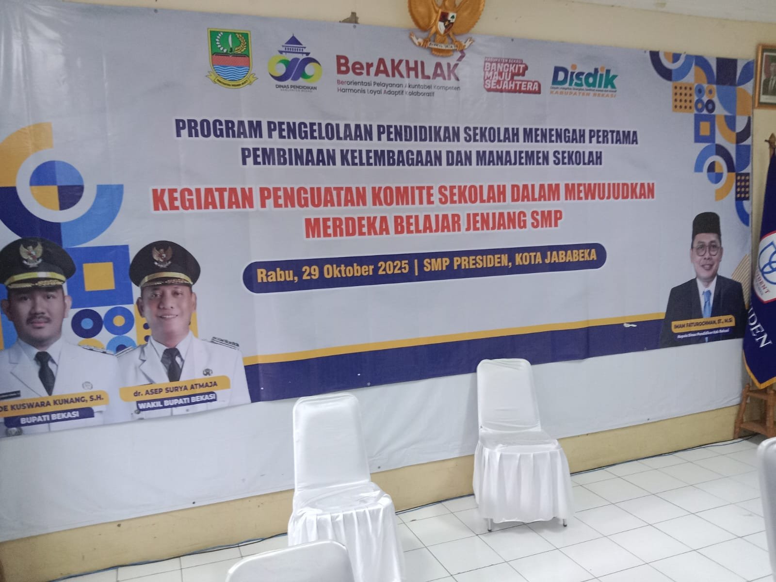 Dinas Pendidikan Kabupaten Bekasi mengundang Ketua Komite Sekolah Menengah Pertama (SMP) Negri atau yang mewakili, dalam acara Program Pengelolaan Pendidikan Sekolah Menengah Pertama Pembinaan kelembagaan dan manajemen Sekolah Serta kegiatan penguatan Komite Sekolah dalam mewujudkan merdeka belajar Jenjang SMP.