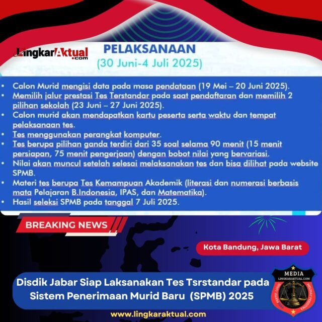 KOTA BANDUNG, Jawa Barat || LINGKARAKTUAL.COM || – Dinas Pendidikan (Disdik) Provinsi Jawa Barat menyatakan kesiapan penuh dalam melaksanakan tes terstandar untuk jalur prestasi pada Sistem Penerimaan Murid Baru (SPMB) 2025. Hal tersebut disampaikan Wakil Koordinator SPMB Disdik Jabar, Dian Peniasyani, saat uji coba pelaksanaan tes terstandar di Kantor Disdik Jabar,