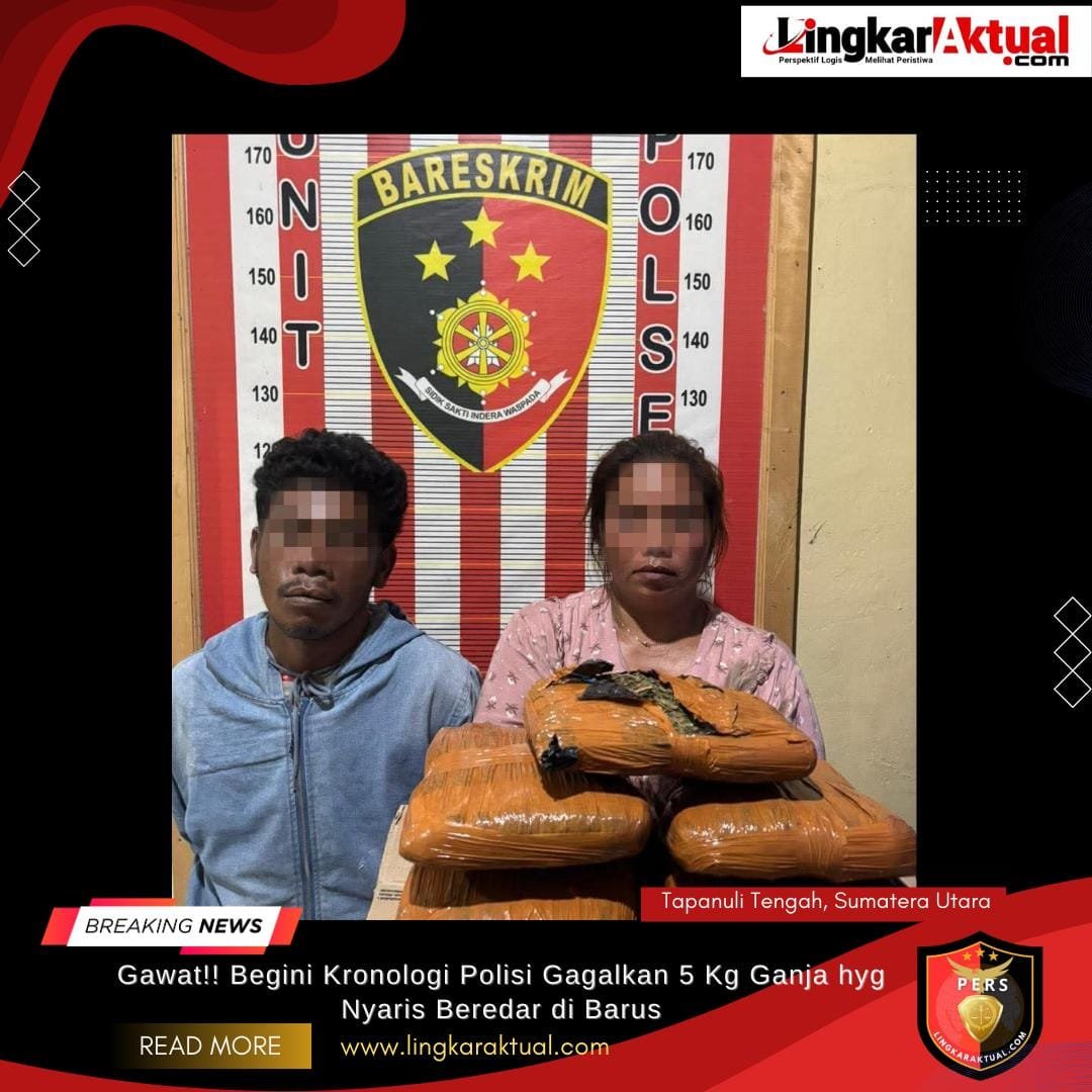 TAPANULI TENGAH, SUMATERA UTARA, LINGKARAKTUAL.COM – Polsek Barus Polres Tapanuli Tengah menggagalkan penyelundupan narkotika jenis ganja seberat 5 kilogram di Desa Kedai Gedang, Kecamatan Barus, Kamis (12/3/2026) dini hari. Dalam operasi tersebut, polisi mengamankan dua orang terduga kurir asal Panyabungan, Mandailing Natal (Madina).