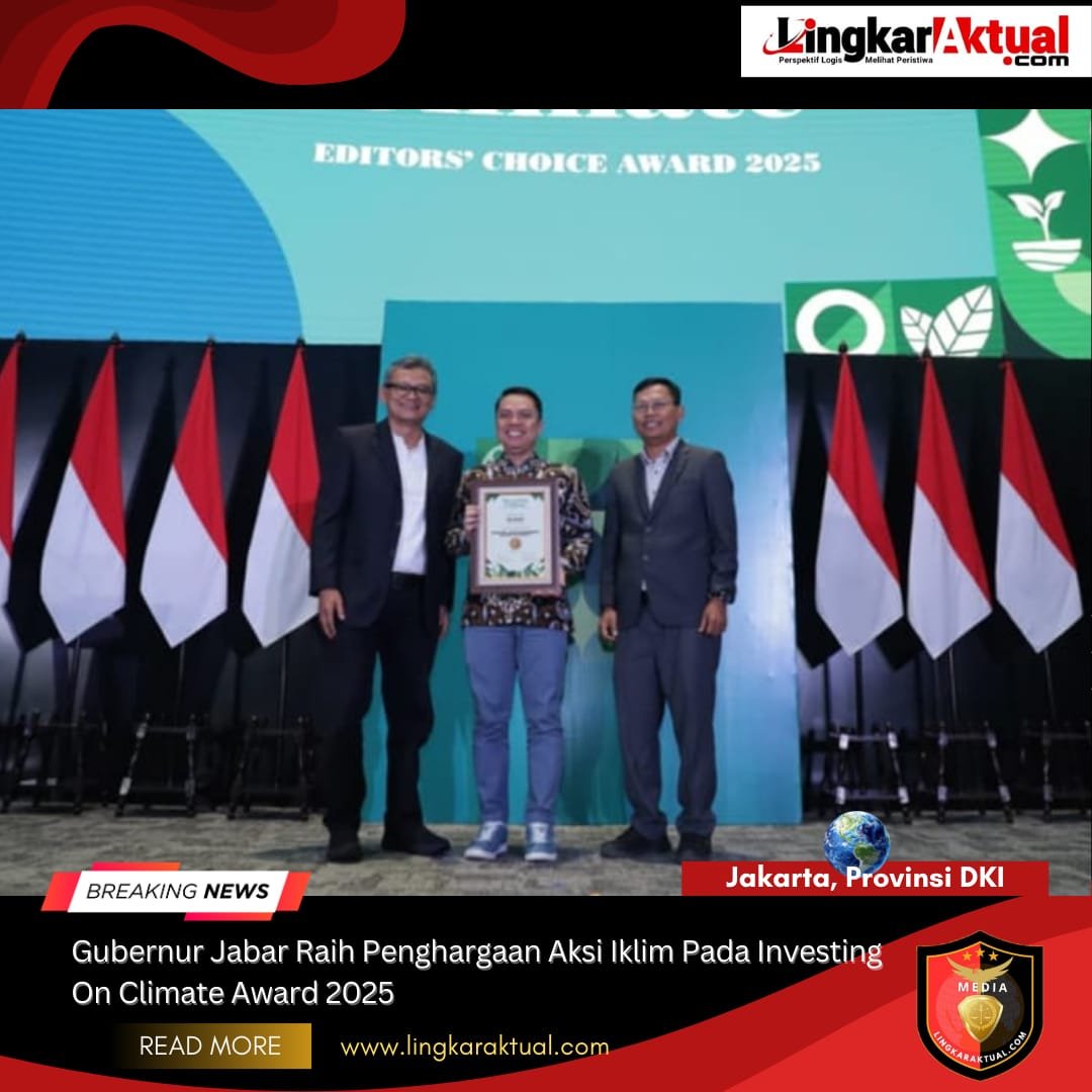 JAKARTA, PROVINSI DKI || LINGKARAKTUAL.COM || – Pemda Provinsi Jawa Barat menerima penghargaan kategori. *Inspirational Figures in Environmental and Social Sustainability pada ajang Investing on Climate Editors’ Choice Award 2025 yang digelar di Bursa Efek Indonesia,* sebagai bentuk apresiasi atas kontribusi dalam penataan lingkungan dan penguatan ketahanan iklim.