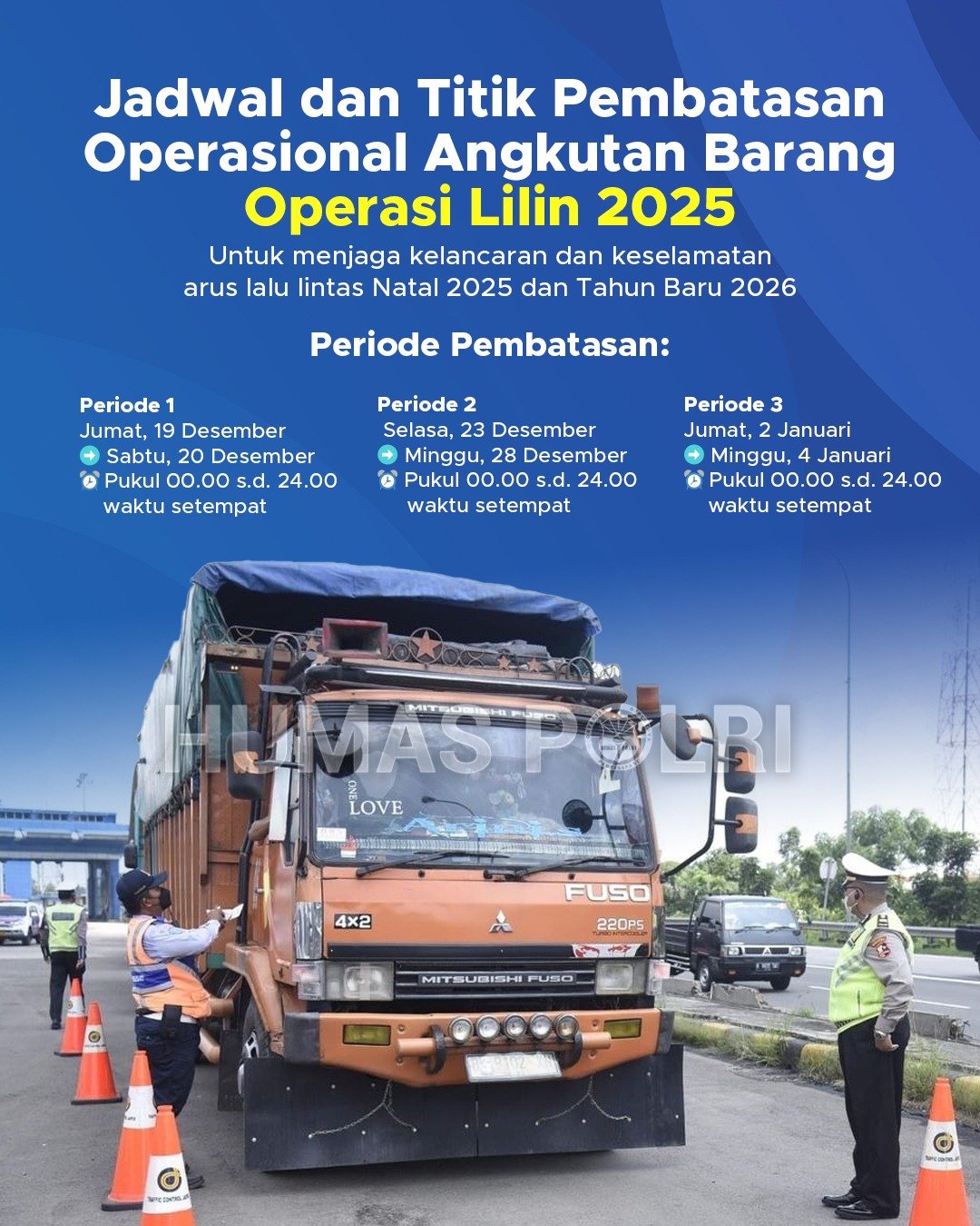 Berikut ini adalah jadwal pemberlakuan pembatasan operasional angkutan barang dalam Operasi Lilin 2025 untuk menjaga kelancaran dan keselamatan arus lalu lintas Natal 2025 dan Tahun Baru 2026.