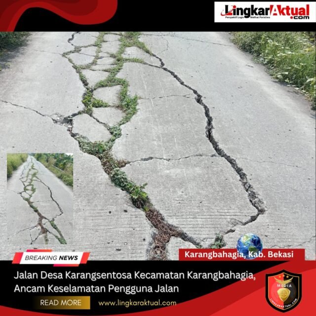 KARANGBAHAGIA, KAB. BEKASI || LINGKARAKTUAL.COM || – Jalan Desa Karang Sentosa Kecamatan Karang Bahagia Bekasi, yang menghubungkan kampung pulo bambu dan warung koting kondisinya sudah sangat parah, bagian badan jalan yang retak hingga berdiameter 5 sampai 10 cm, dikhawatirkan mengancam ke selamatan warga pengguna jalan tersebut.