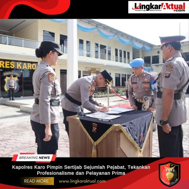 TANAH KARO, SUMATERA UTARA, LINGKARAKTUAL.COM – Kapolres Karo AKBP Pebriandi Haloho, S.H., S.I.K., M.Si., memimpin langsung upacara serah terima jabatan (sertijab) sejumlah pejabat di lingkungan Polres Karo, Rabu(15/4/2026) pagi di halaman Mapolres Karo. Kegiatan ini menjadi momentum penting dalam penyegaran organisasi sekaligus peningkatan kinerja pelayanan kepada masyarakat.