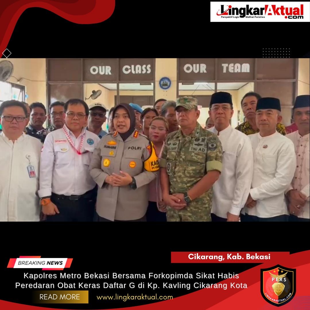 CIKARANG, KABUPATEN BEKASI, LINGKARAKTUAL.COM – Upaya pemberantasan peredaran obat keras daftar G kembali digencarkan jajaran kepolisian. Polres Metro Bekasi bersama unsur Forkopimda melakukan operasi terpadu di wilayah Kampung Kavling, Cikarang Kota, Kabupaten Bekasi.
