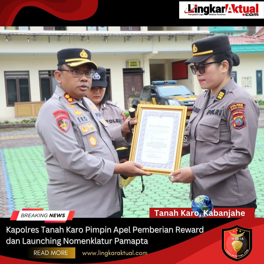 TANAH KARO, KABANJAHE, SUMATERA UTARA || LINGKARAKTUAL.COM || – Lingkaraktual.com Polres Tanah Karo melaksanakan Apel Pemberian Reward kepada Personel Berprestasi sekaligus Launching Penyesuaian Nomenklatur Pamapta, yang berlangsung di lapangan apel Mapolres Tanah Karo, Senin(20/10/2025) pukul 08.00 WIB.