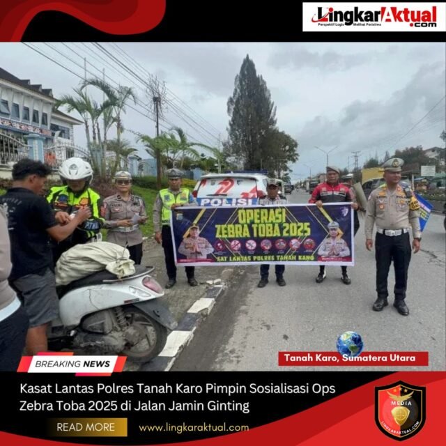 TANAH KARO, SUMATERA UTARA || LINGKARAKTUAL.COM ||- Satuan Lalu Lintas Polres Tanah Karo gencar melaksanakan sosialisasi Operasi Zebra Toba 2025. Pada Kamis(28/11/2025), Kasat Lantas Polres Tanah Karo AKP Andita Sitepu, S.H., M.H., turun langsung memimpin kegiatan sosialisasi di Jalan Jamin Ginting, tepatnya di depan Kantor Bupati Karo, Kabanjahe.