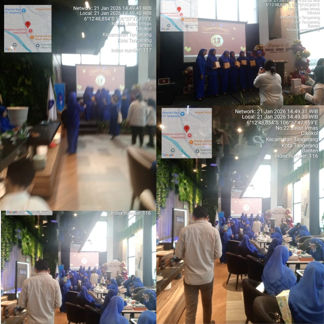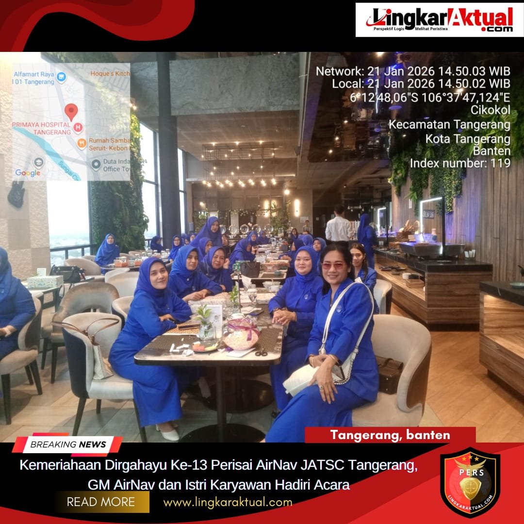 TANGERANG, BANTEN || LINGKARAKTUAL.COM || – Perisai AirNav JATSC Tangerang merayakan hari jadinya yang ke-13 dengan kemeriahan yang luar biasa. Acara ini diadakan pada tanggal 22 Januari 2026 di Hotel Mercure Tangerang Center, Arumbae Restaurant. Kehadiran GM AirNav, Bapak Widodo, sebagai penasehat Perisai AirNav, dan Ketua Perisai AirNav, Ibu GM Tutik Kusmiyati, menambah kesemarakan acara ini.