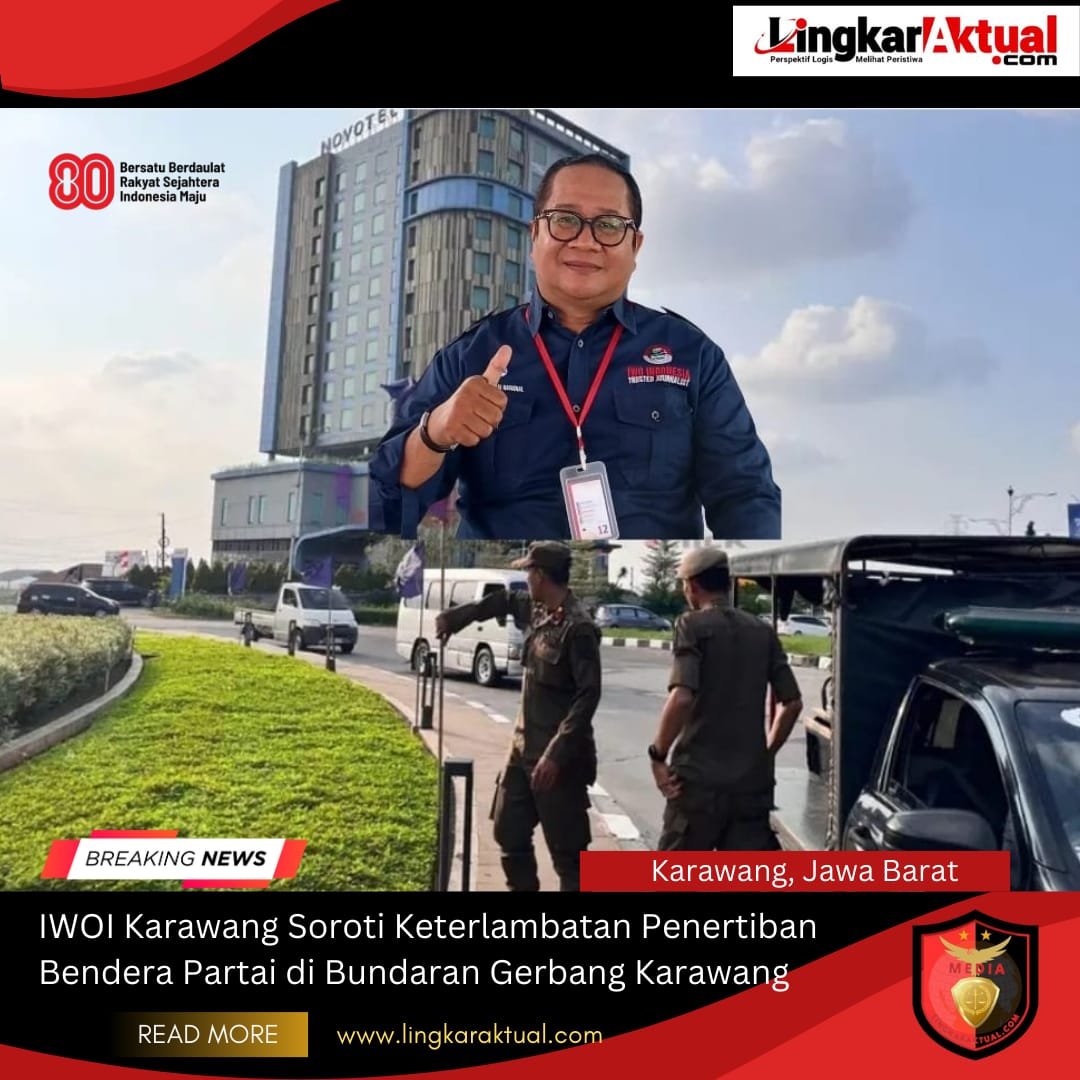 KARAWANG, Jawa Barat || LINGKARAKTUAL.COM || – Ketua Ikatan Wartawan Online Indonesia (IWOI) DPD Kabupaten Karawang, Syuhada Wisastra, mengapresiasi langkah Satuan Polisi Pamong Praja (Satpol PP) bersama Dinas Lingkungan Hidup (DLH) Kabupaten Karawang yang menertibkan bendera partai politik terpasang di Taman Bundaran Gerbang Karawang pada Minggu (24/8/2025).