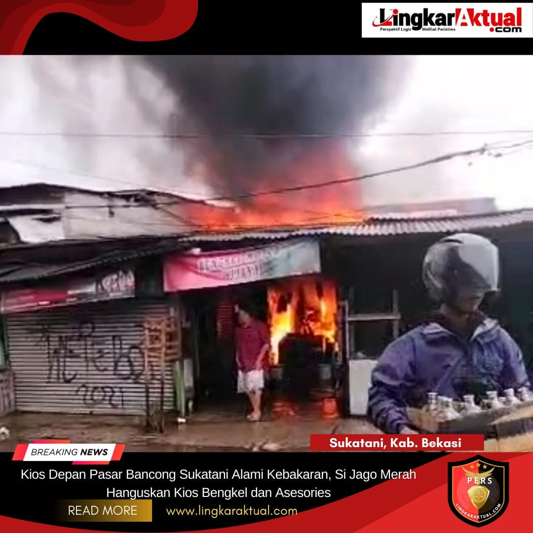 SUKATANI, KABUPATEN BEKASI || LINGKARAKTUAL.COM || – Kebakaran terjadi di depan Pasar Bancong, Kecamatan Sukatani, Kabupaten Bekasi, Jumat (23/1/2026) pagi.