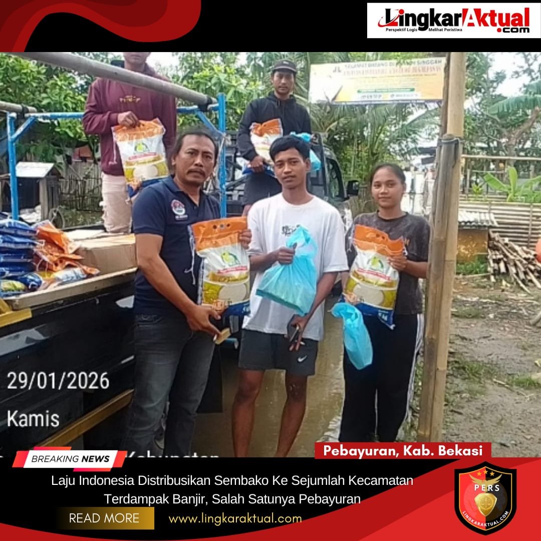 PEBAYURAN, KABUPATEN BEKASI || LINGKARAKTUAL.COM || – Laju Indonesia melakukan pendistribusian bantuan sembako ke beberapa wilayah kecamatan yang terdampak banjir akibat curah hujan ekstrem yang melanda Kabupaten Bekasi dalam beberapa waktu terakhir. Salah satu wilayah yang menjadi sasaran distribusi bantuan tersebut adalah Kecamatan Pebayuran.