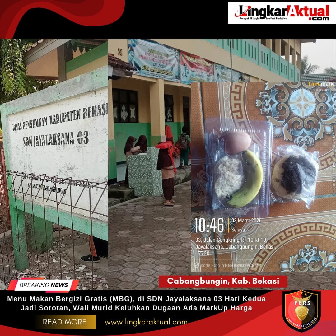 CABANGBUNGIN, KABUPATEN BEKASI, LINGKARAKTUAL.COM – Pelaksanaan hari kedua program Makan Bergizi Gratis (MBG) di SDN Jayalaksana 03 Desa Jayalaksana, Kecamatan Cabangbungin, Kabupaten Bekasi, memicu reaksi keras dari sejumlah orang tua siswa. Pasalnya, menu yang disajikan dinilai tidak sebanding dengan standar anggaran yang ditetapkan, sehingga muncul dugaan adanya praktik markup harga, pada Selasa (3/3/2026).
