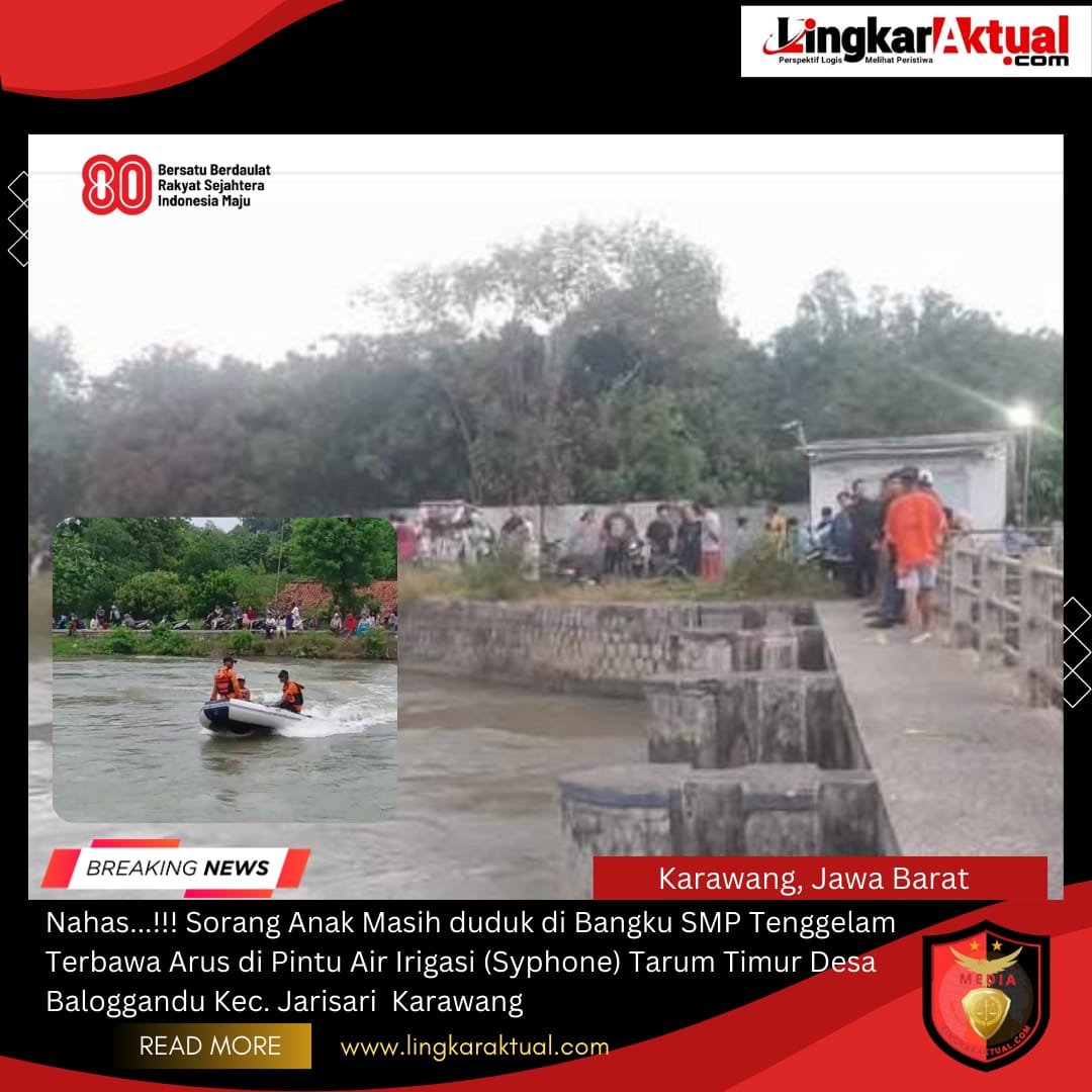 KARAWANG, Jawa Barat || LINGKARAKTUAL.COM || || – Peristiwa nahas terjadi di Desa Balonggandu Kec. Jatisari Kabupaten Karawang, seorang siswa masih di bangku SMP Hanyut terbawa arus air saat bermain dan berenang di Syphon Pintu air tarum timur. Kamis (14/08).