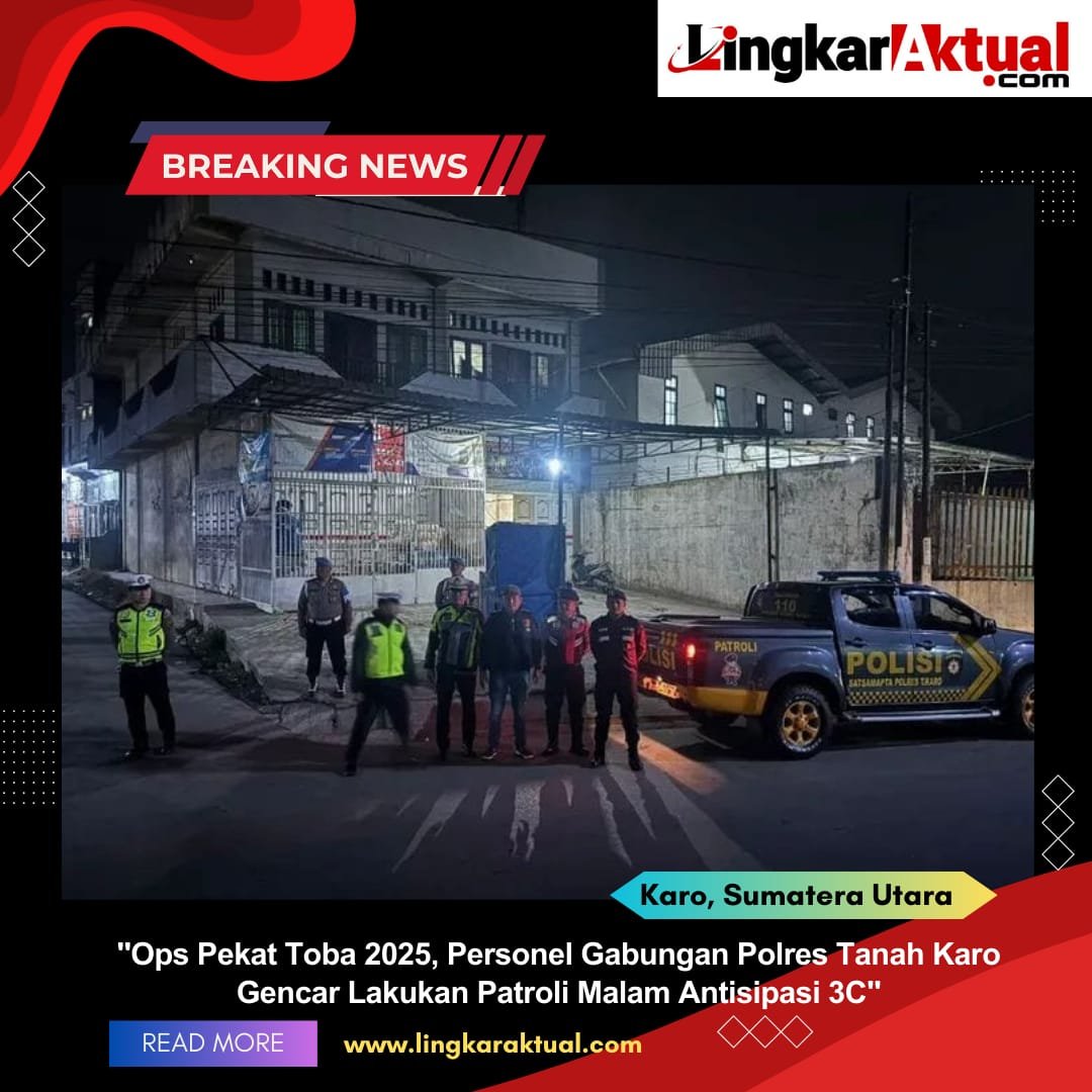 TANAH KARO, Sumatera Utara || LINGKARAKTUAAL.COM || Dalam rangka menciptakan situasi keamanan dan ketertiban masyarakat (harkamtibmas) yang kondusif, personel gabungan Polres Tanah Karo kembali menggelar Patroli Stasioner pada Senin(12/05/2025) dini hari melalui kegiatan Operasi Pekat Toba 2025. Patroli ini difokuskan untuk mengantisipasi kejahatan 3C (Curat, Curas, Curanmor) dan tindak pidana lainnya.