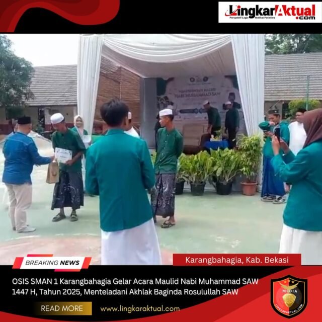 KARANGBAHAGIA, KABUPATEN BEKASI || LINGKARAKTUAL.COM || – OSIS SMAN 1 Karang Karang Bahagia menggelar acara Maulid Nabi Muhammad SAW didepan halaman SMAN 1 Karang Bahagia sebagai momen untuk meneladani akhlak beliau. Selasa (30/09/2025).