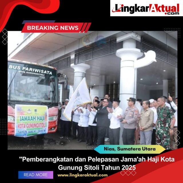 NIAS-GUNUNGSITOLI, Sumatera Utara || LINGKARAKTUAL.COM || – Wali Kota Gunungsitoli Sowa’a Laoli, S.E., M.Si memberangkatkan dan melepas secara resmi Jama’ah Haji Kota Gunungsitoli Tahun 1446 H / 2025 M yang dilaksanakan di Halaman Kantor Wali Kota Gunungsitoli, Kamis (15/05/2025).
