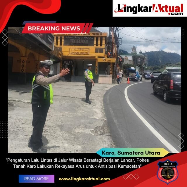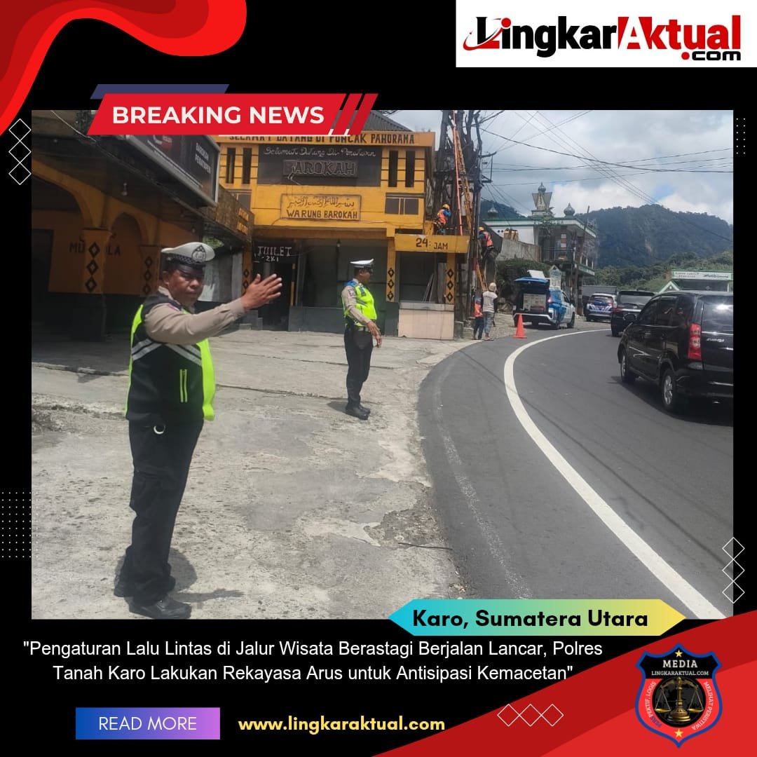 BERASTAGI-TANAH KARO, Sumatera Utara || – LINGKARAKTUAL.COM || Guna mengantisipasi kepadatan kendaraan menuju kawasan wisata Berastagi, Polres Tanah Karo melalui Satuan Lalu Lintas melaksanakan kegiatan pengaturan dan rekayasa lalu lintas pada Sabtu (24/5/2025). Kegiatan ini berlangsung sejak Pukul 11.30 WIB hingga 18.00 WIB dan difokuskan di sejumlah titik rawan kemacetan di sepanjang jalur wisata dari perbatasan Tanah Karo – Deli Serdang menuju Kota Berastagi.