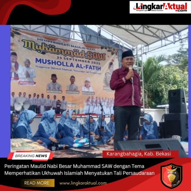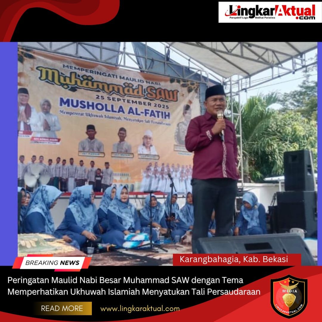 KARANGBAHAGIA, KABUPATEN BEKASI || LINGKARAKTUAL.COM || – Bertempat di halaman Mushollah Al Fatih Kepala Desa Karang Satu SARIM Mengadakan Peringatan Hari Lahirnya Nabi Besar Muhammad SAW, dengan beralaskan tikar seluruh jamaah yang hadir sangat atusias mendengarkan ceramah di acara Maulid Nabi Besar Muhammad SAW yang bertemakan “Memperhatikan Ukuwah Islamiyah Menyatukan Tali Persaudaraan”. Kamis (25/09/2025).