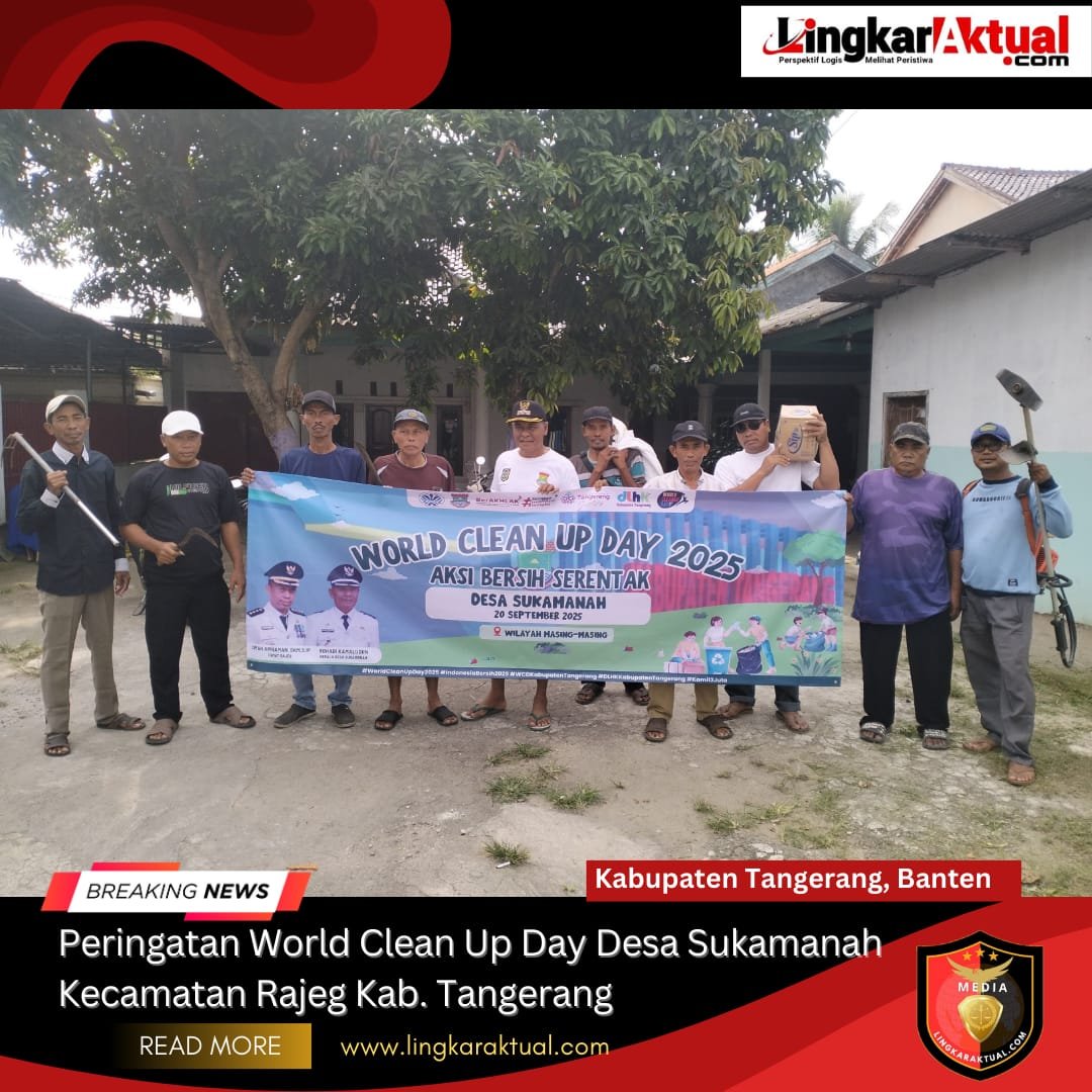 KABUPATEN TANGERANG, BANTEN || LINGKARAKTUAL.COM || – Dalam rangka peringatan World Clean Up Day (WCD) 2025, Pemerintah Desa Sukamanah Kecamatan Rajeg Kabupaten Tangerang, mengelar aksi kerja bakti masal di berbagai titik wilayah Desa Sukamanah, Sabtu (20/09/2025).
