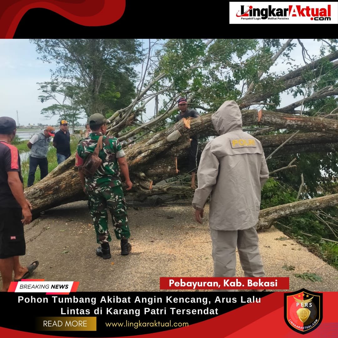 PEBAYURAN, KABUPATEN BEKASI, LINGKARAKTUAL.COM – Pebayuran Sebuah pohon tumbang akibat angin kencang di Jalan Raya Pisangan–Pulo Pipisan, Desa Karangpatri, Kecamatan Pebayuran, Kabupaten Bekasi, Selasa (3/3/2026).