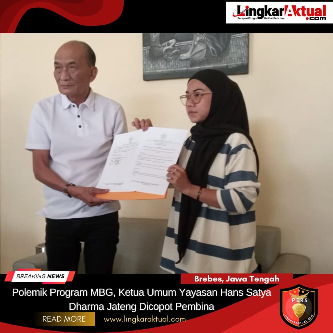 BREBES, JAWA TENGAH || LINGKARAKTUAL.COM || – Gejolak internal mengguncang Yayasan Hans Satya Dharma (HSD) Jawa Tengah. Pendiri sekaligus Pembina yayasan, Handono Sivananda, resmi memberhentikan Ketua Umum Yayasan HSD Jateng, Turnya, menyusul polemik yang berkembang terkait Program Makan Bergizi Gratis (MBG) di Kabupaten Brebes.