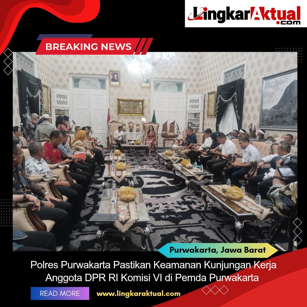 PURWAKARTA, Jawa Barat || LINGKARAKTUAL.COM || Polres Purwakarta melaksanakan pengamanan dan monitoring dalam kegiatan Rapat Koordinasi dan Kunjungan Kerja Anggota DPR RI Komisi VI, Dr. Rieke Diah Pitaloka Intan Purnamasari, yang berlangsung di Bale Nagri Setda Kabupaten Purwakarta, Pada Kamis, 15 Mei 2025