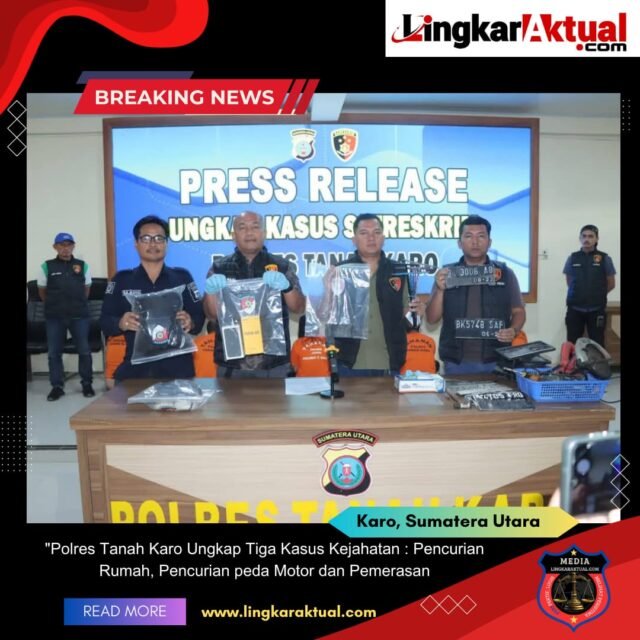 TANAH KARO, Sumatera Utara || Lingkaraktual.com || – Lingkaraktual.com – Polres Karo kembali menunjukkan komitmennya dalam penegakan hukum dengan menggelar konferensi pers pengungkapan tiga kasus tindak pidana yang terjadi di wilayah hukumnya.