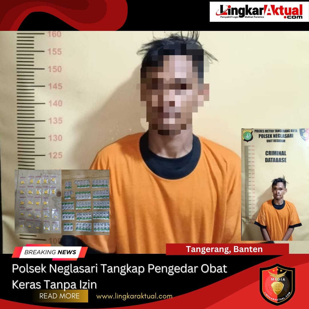 TANGERANG, BANTEN || LINGKARAKTUAL.COM || – Jajaran Polsek Neglasari Polres Metro Tangerang Kota berhasil mengungkap kasus peredaran obat keras tanpa izin di wilayah hukumnya. Seorang pemuda berinisial N (21) diamankan petugas bersama barang bukti ratusan butir obat keras jenis Tramadol dan Exymer.