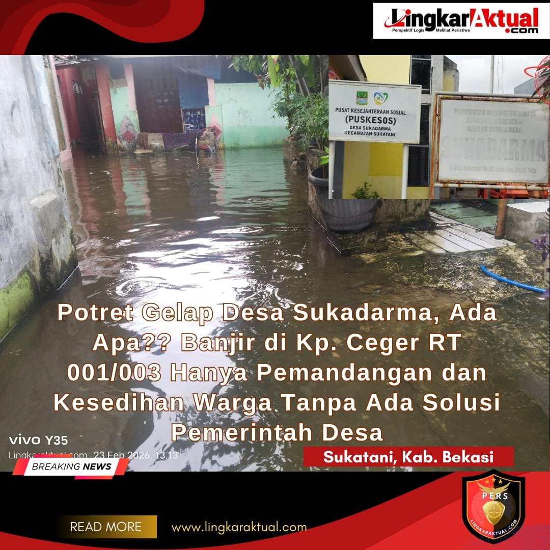 SUKATANI, KABUPATEN BEKASI, LINGKARAKTUAL.COM – Banjir yang terus berulang di wilayah Kampung Ceger RT 001/003, Desa Sukadarma, Kecamatan Sukatani, Kabupaten Bekasi menjadi potret kelam yang hingga kini belum menemukan solusi nyata. Senin (23/02/2026).