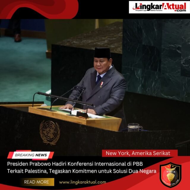 NEW YORK, AMERIKA SERIKAT || LINGKARAKTUAL.COM || – Presiden Republik Indonesia, Prabowo Subianto, menghadiri High-Level International Conference for the Peaceful Settlement of the Question of Palestine and the Implementation of the Two-State Solution atau Konferensi Internasional Tingkat Tinggi untuk Penyelesaian Damai atas Masalah Palestina dan Implementasi Solusi Dua Negara yang digelar di Gedung Majelis Umum Perserikatan Bangsa-Bangsa (PBB), New York, Amerika Serikat, pada Senin, 22 September 2025.