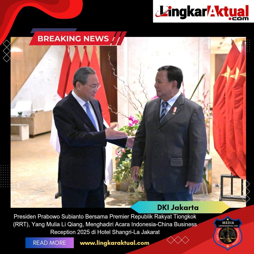 JAKARTA || LINGKARAKTUAL.COM || — Presiden Prabowo Subianto bersama Premier Republik Rakyat Tiongkok (RRT), Yang Mulia Li Qiang, menghadiri acara Indonesia-China Business Reception 2025 yang digelar di Hotel Shangri-La, Jakarta, pada Sabtu, 24 Mei 2025.