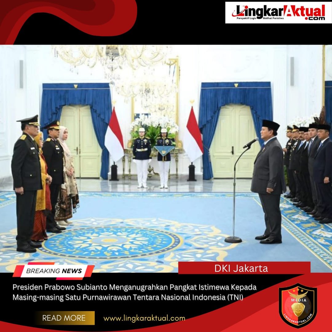 JAKARTA || LINGKARAKTUAL.COM || – Presiden Prabowo Subianto menganugerahkan pangkat istimewa kepada masing-masing satu purnawirawan Tentara Nasional Indonesia (TNI) dan Kepolisian Negara Republik Indonesia (Polri).