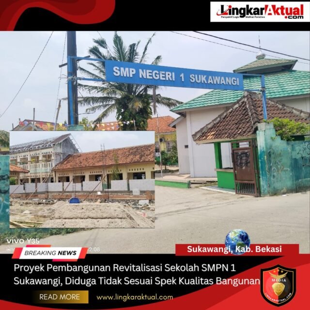 SUKAWANGI, KABUPATEN BEKASI || LINGKARAKTUAL.COM || – Proyek pembangunan revitalisasi Sekolah Menengah Pertama Negeri (SMPN) 1 Sukawangi, Kabupaten Bekasi, menuai sorotan publik. Pasalnya, pekerjaan yang seharusnya menjadi sarana peningkatan mutu pendidikan itu diduga tidak sesuai dengan spesifikasi (speck) yang telah ditetapkan dalam kontrak kerja. Jumat (17/10/2025).