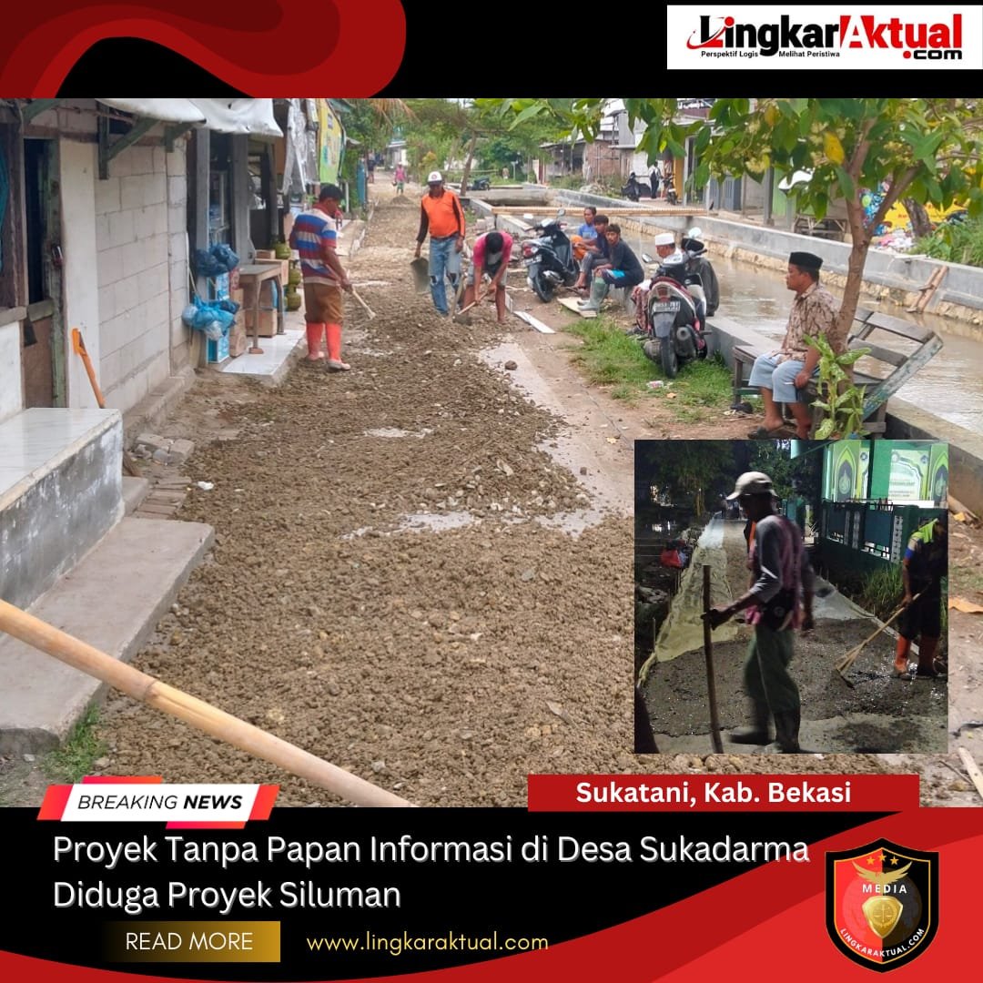 SUKATANI, KABUPATEN BEKASI || LINGKARAKTUAL.COM || – Pelaksanaan pekerjaan proyek jalan lingkungan di desa sukadarma kecamatan sukatani kabupaten bekasi di duga melanggar aturan karena tidak memasang papan plang nama kegiatan sebagai mana di wajibkan oleh undang-undang hal ini menimbulkan kecurigaan bahwa proyek yang di danai oleh alokasi dana desa (ADD) tersebut adalah proyek siluman. Jumat (19/09/2025).