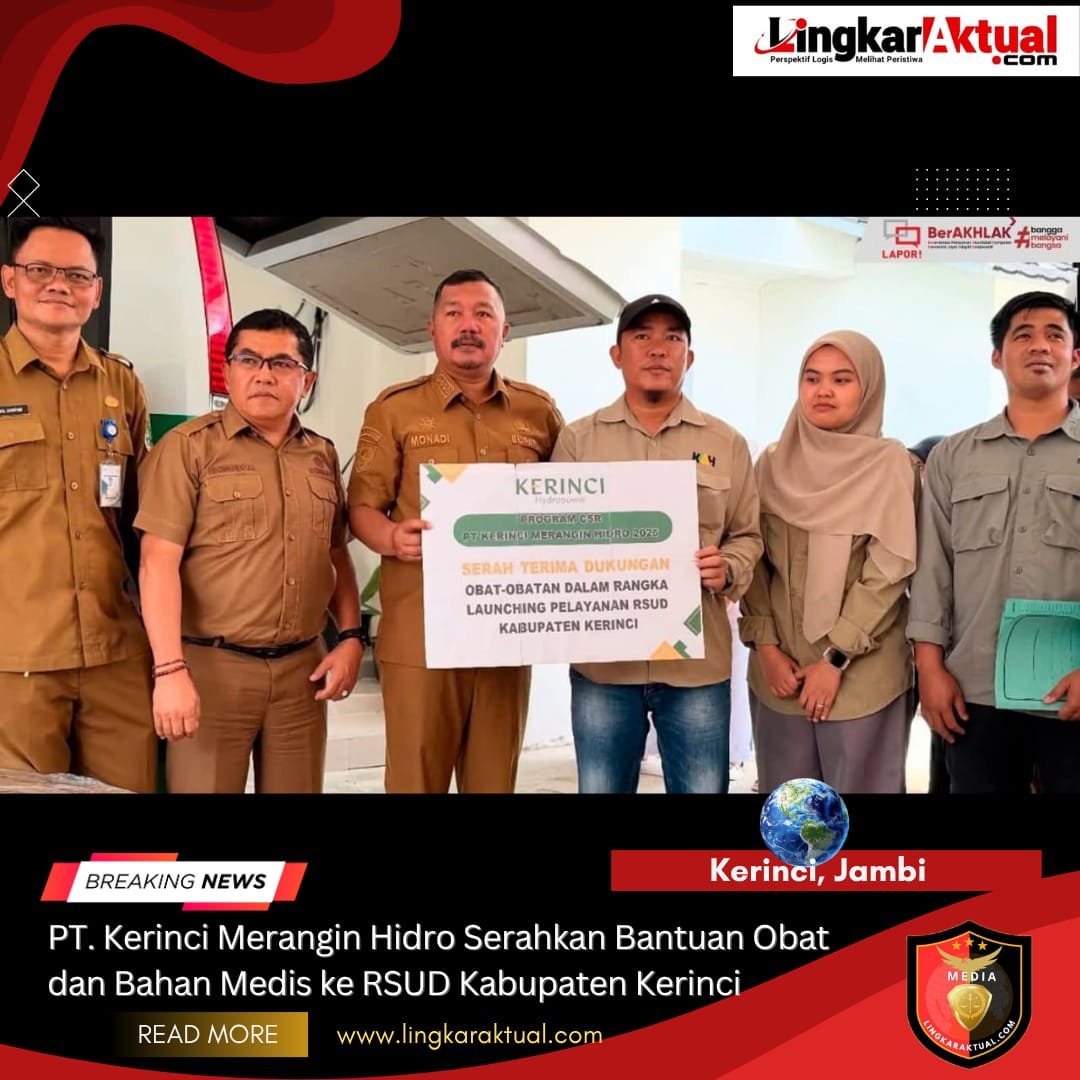 KERINCI, JAMBI || LINGKARAKTUAL.COM || – Rumah Sakit Umum Daerah (RSUD) Kabupaten Kerinci menerima bantuan obat-obatan dan alat kesehatan dari PT Kerinci Merangin Hidro (KMH). Bantuan yang diangkut menggunakan tiga mobil box tersebut diserahkan langsung kepada pihak rumah sakit sebagai bentuk kepedulian perusahaan terhadap peningkatan layanan kesehatan di daerah itu.