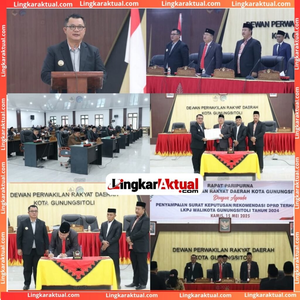 NIAS-GUNUNGSITOLI, Sumatera Utara || LINGKARAKTUAL.COM || – Wali Kota Gunungsitoli Sowa’a Laoli, SE, M.Si menghadiri rapat Paripurna DPRD Kota Gunungsitoli Dalam Rangka Penyampaian Rekomendasi DPRD Kota Gunungsitoli Terhadap LKPJ Wali Kota Gunungsitoli Tahun Anggaran 2024 yang bertempat di Ruang Rapat DPRD Kota Gunungsitoli, Kamis (15/05/2025).