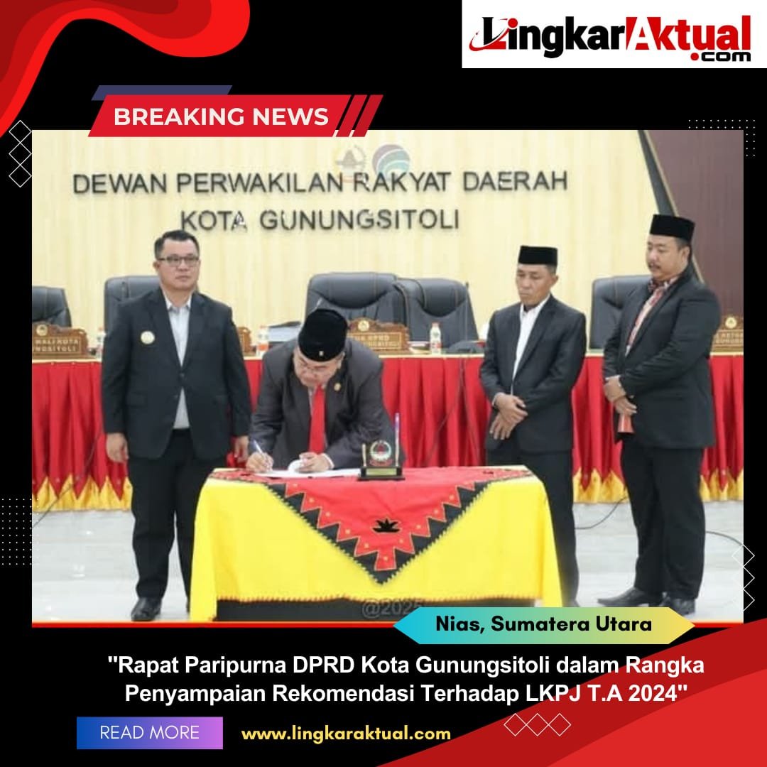 NIAS-GUNUNGSITOLI, Sumatera Utara || LINGKARAKTUAL.COM || – Wali Kota Gunungsitoli Sowa’a Laoli, SE, M.Si menghadiri rapat Paripurna DPRD Kota Gunungsitoli Dalam Rangka Penyampaian Rekomendasi DPRD Kota Gunungsitoli Terhadap LKPJ Wali Kota Gunungsitoli Tahun Anggaran 2024 yang bertempat di Ruang Rapat DPRD Kota Gunungsitoli, Kamis (15/05/2025).