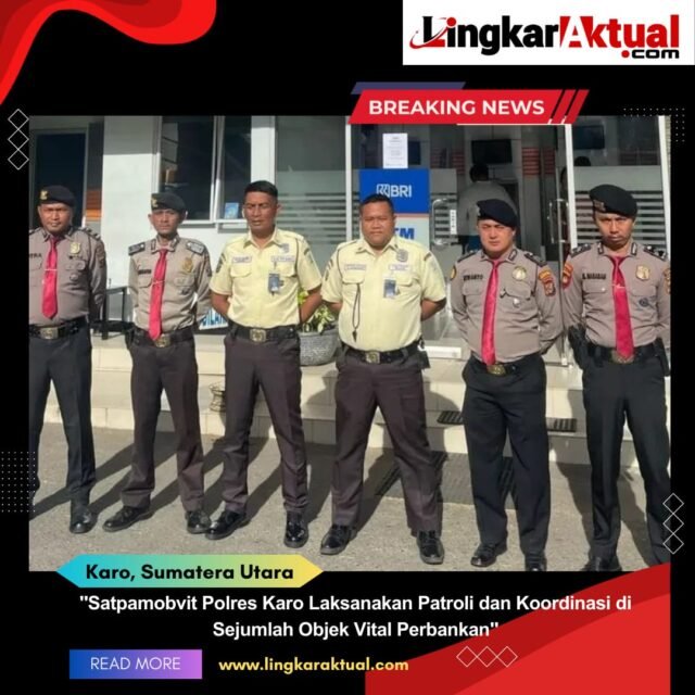TANAH KARO, Sumatera Utara || LINGKARAKTUAL.COM || – Dalam rangka menjaga situasi keamanan dan ketertiban masyarakat (Kamtibmas), personel Satuan Pengamanan Objek Vital (Satpamobvit) Polres Tanah Karo melaksanakan kegiatan patroli dan koordinasi di sejumlah objek vital perbankan yang berada di wilayah Kabanjahe, Kabupaten Karo, pada Sabtu (10/5/2025).